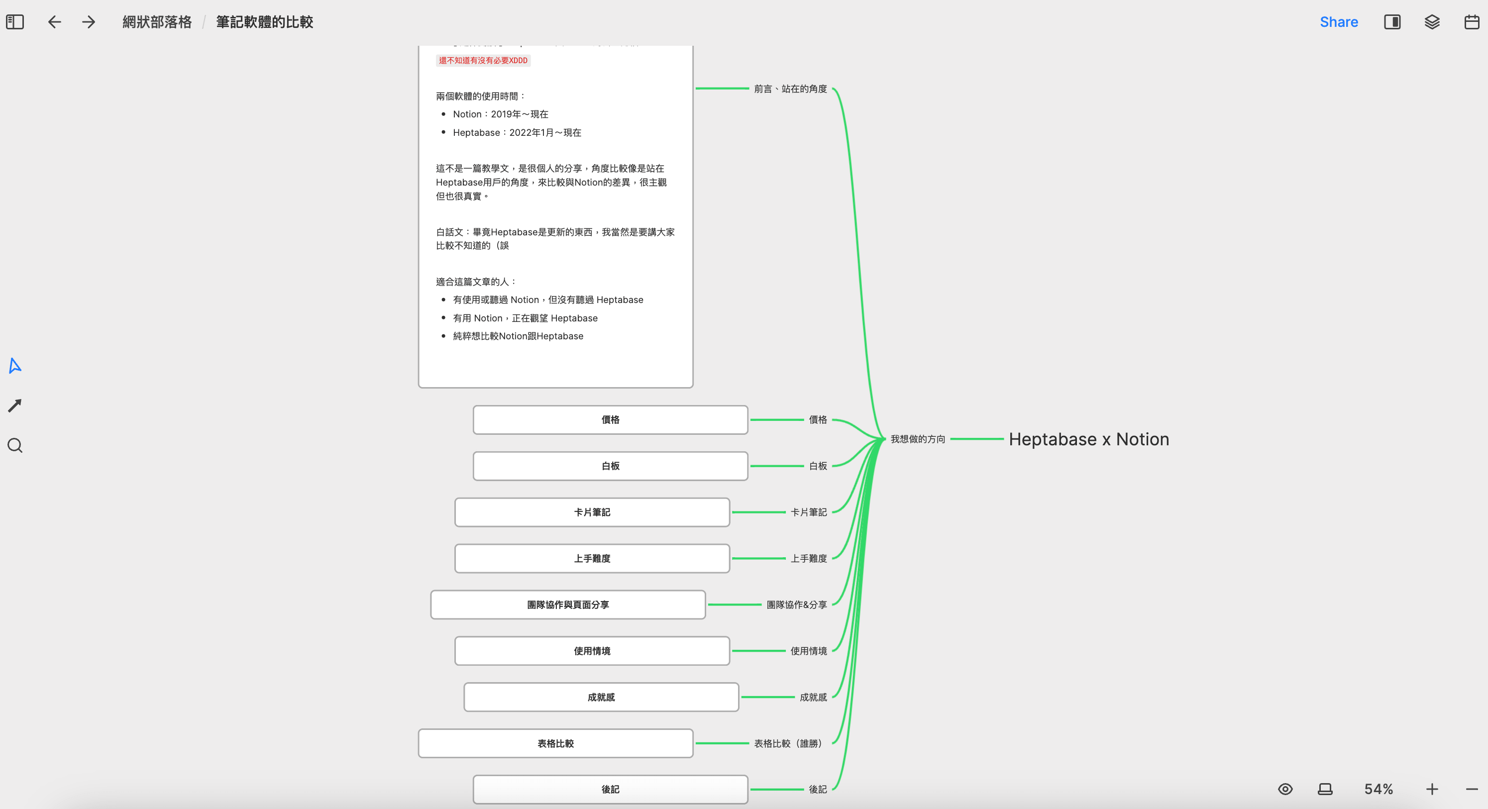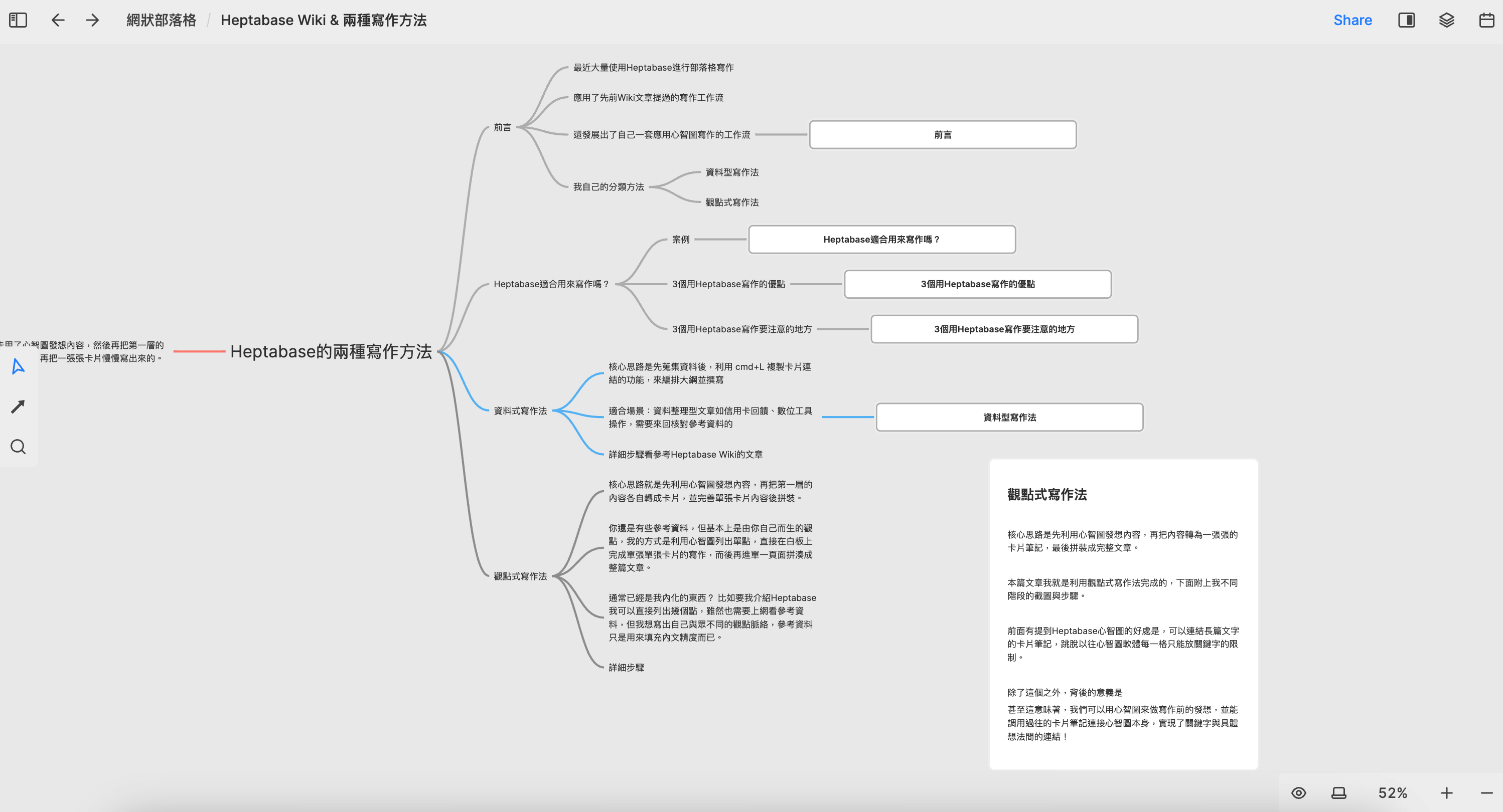 - 適合從前就習慣使用Xmind、Gitmind等心智圖軟體的人,你可以無痛轉移到Heptabase並實現All in One的輸出