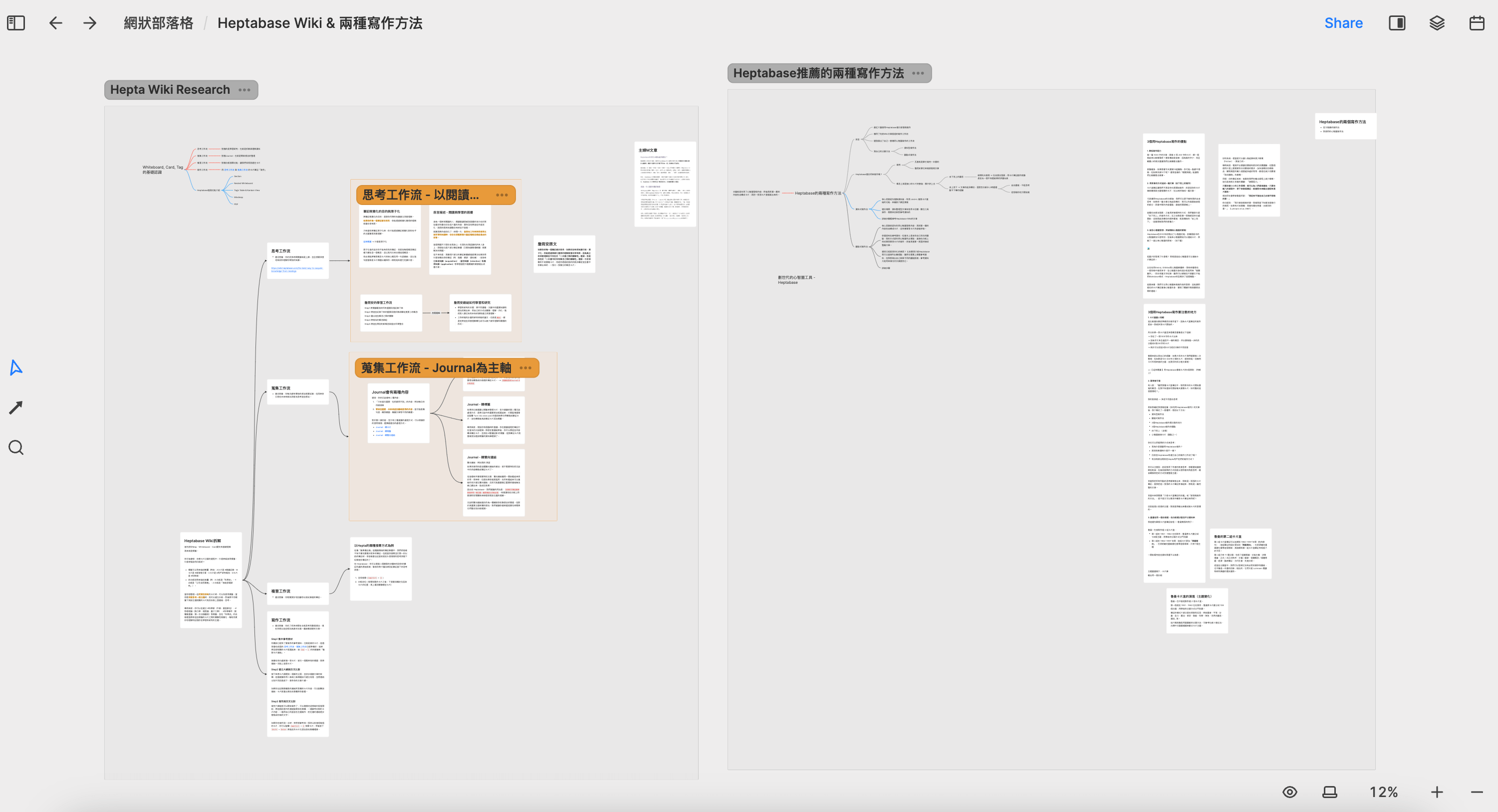 而在 白板② 「Heptabase Wiki & 兩種寫作方法」中,放的文章是《Heptabase Wiki推薦的四種使用方法》,並且因為這篇文章有提及一個官方推薦的寫作方法,但我又想寫現在這篇《Heptabase寫作的兩種方法》,所以就把兩者放在同一個專案白板裡了。 (因為他們有關聯)