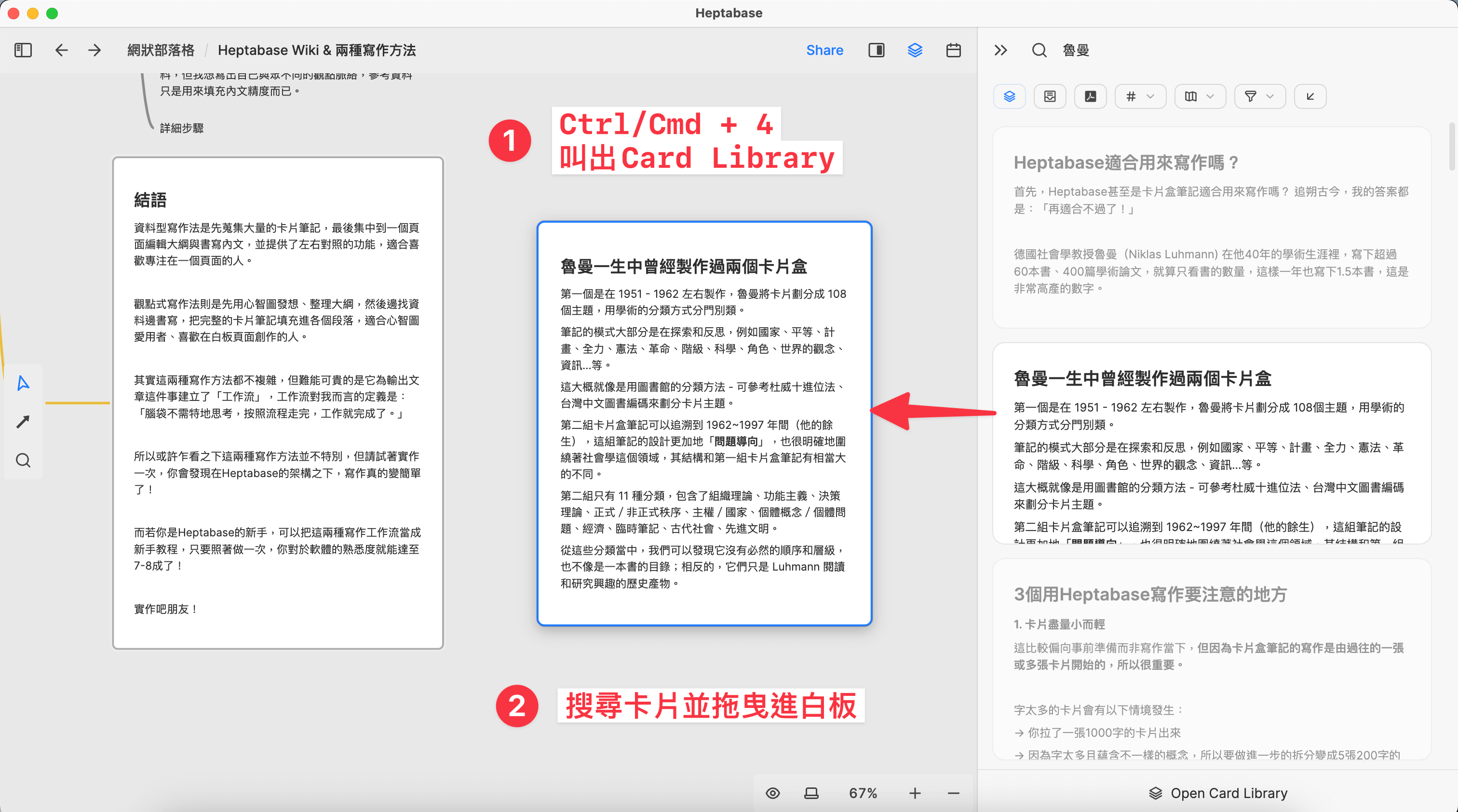 而如果在書寫過程需要參考過往的卡片筆記,只要使用快捷鍵 Cmd/ctrl + 4 打開Card Library,就可以搜尋卡片並用滑鼠拖曳至白板,我更喜歡用這樣的方式加入卡片! (非常直覺)